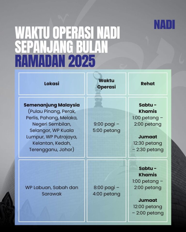 π ππππ¨π ππ‘ πͺπππ§π¨ π’π£ππ₯ππ¦π π‘πππ π¦ππ£ππ‘πππ‘π ππ¨πππ‘ π₯ππ ππππ‘Sepanjang bulan Ramadan, NADI akan beroperasi mengikut jadual berikut: Semenanjung Malaysia9:00 pagi β 5:00 petang WP Labuan, Sabah & Sarawak8:00 pagi β 4:00 petangKami di NADI mengucapkan selamat menjalani ibadah puasa #NADI#Ramadan2025#WaktuOperasiNADI
